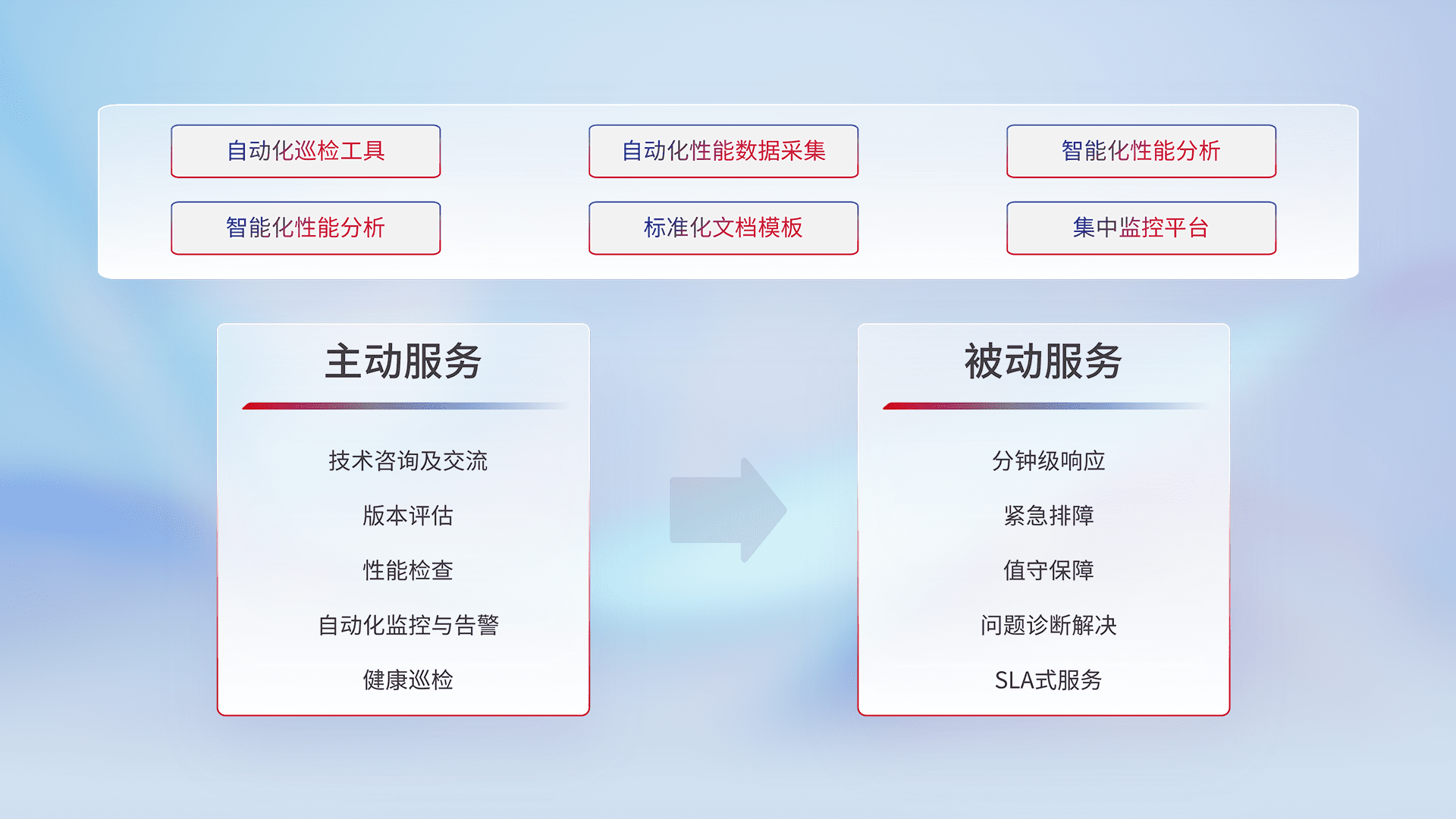 智能化工具和标准化文档,,,,保障服务质量,,提供主动服务(包含技术咨询、、、、版本评估、、性能检查、、自动化监控与告警、、、、健康巡检)和被动服务包含(分钟级响应、、、紧急排障、、、、值守保障、、、、问题诊断解决、、SLA服务)。。
